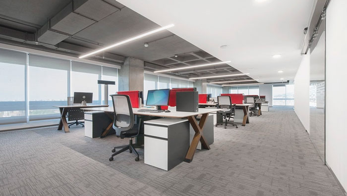 辦公區域的設計:設計師在打造辦公室的同時,也在強調室內與室外之間的聯動,在設計師看來復雜的金融對于每一位員工來說,長期都會讓人感到心力交瘁,這也是極簡設計受歡迎的原因,因為簡單的空間本身就擁有抵消復雜的效果,一線江景的引入也是為了給員工營造一個輕松、舒適的辦公空間。
