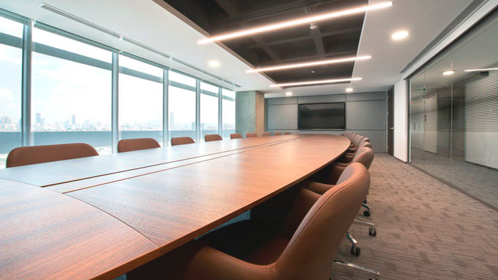 會議室的設計:整個會議桌呈橢圓式分布,幾乎占據了整個空間的中心區域,這樣做也是為了滿足企業對于人數的需求,同時也是為了采用去中心的設計手法,在這樣的空間中思維與想法不會受到任何的阻隔,同時水景的引入,也給會議一種一往無前的暗示。