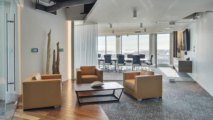 接待區(qū)域的設(shè)計(jì):通過此處的玻璃門窗,可以看出前臺與接待空間是兩個(gè)獨(dú)立的空間,而會(huì)議室與接待區(qū)域通過是兩個(gè)不同的空間,這樣設(shè)計(jì)的目的就是在滿足各個(gè)功能需求的同時(shí),可以同時(shí)保證空間的完整,接待區(qū)域在其中起到承上啟下的作用,與其本身的屬性完美的結(jié)合在一起。