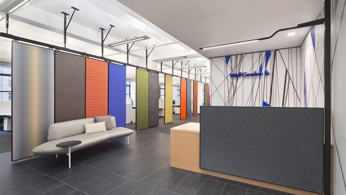 前臺的設計:前臺與辦公區域位于空間的左右兩側,設計師在辦公室設計中,將隔斷打造成布匹的模樣懸掛在空間的中心區域,這樣一來客戶進門后看到的就是一段段懸掛著的布匹,在顯示企業屬性的同時,也起到空間阻隔的作用,前臺縱橫加錯的絲線仿佛是織布的線條,這無不在顯示企業的屬性。