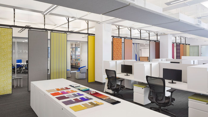 辦公區域的設計:懸掛的隔斷如一扇扇門將辦公區域擋在視線之外,但懸掛的隔斷不是死的而是靈活的,一扇扇可拉可合,開放的辦公區加上半封閉的個人辦公區,兩者之間形成一個很好的結合,這樣的設計旨在消除弊端,同時也在為企業營造利于發展的辦公新格局。