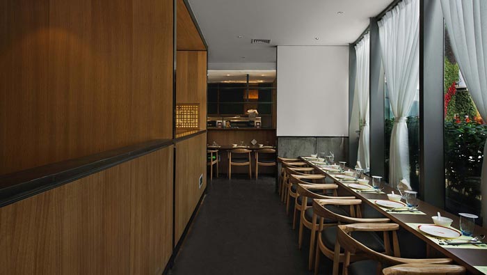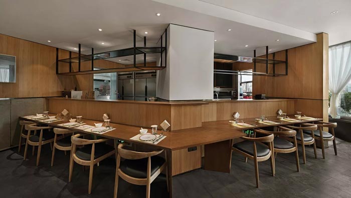 特色川菜館廚房餐區設計:設計師在廚房外圍的周邊,打造了一處直角餐區,客戶可以邊就餐,邊看到廚房的情況,讓客戶吃的放心、吃的安心,同時也為餐館營造了10個餐位。