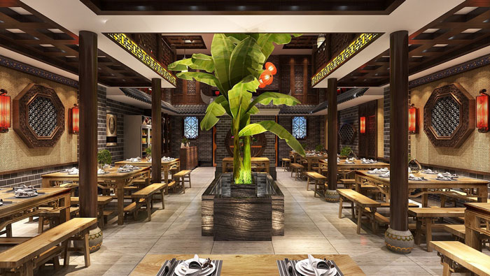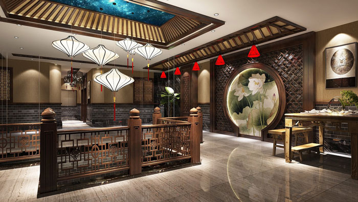 中式川菜館大廳裝修設計:大廳給人的感覺好似回到過去,但是又稍有不同,設計師在中式設計的同時,也加入了很多現(xiàn)代元素,目的就是希望營造一個古代、現(xiàn)代融合的空間。