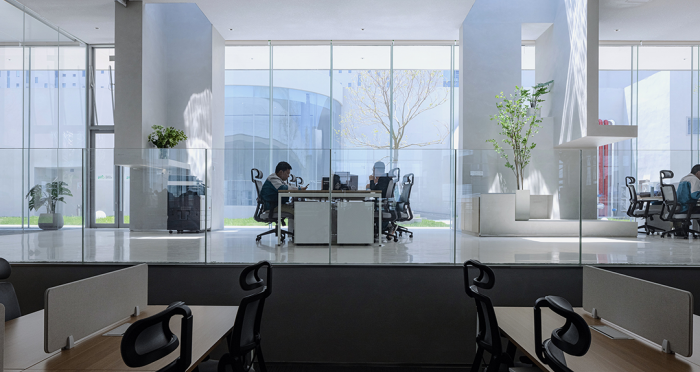 展廳、會客廳和行政會議室凸出水面,辦公區、會議室、員工食堂、廚房和多功能廳等大部分空間沉在水面以下,墻柱等構筑物和房間像細胞器一樣自由分布,具有極好的漫射采光。