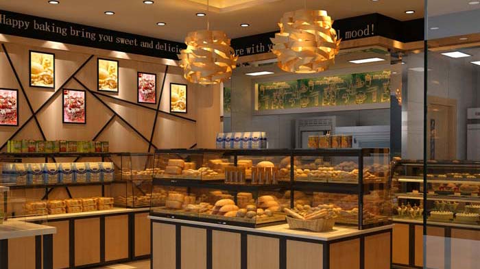 蛋糕店暖色燈光把產(chǎn)品襯托的更加新鮮,右手邊從托盤(pán)柜到面包展示平臺(tái)再到中島柜、蛋糕模型柜產(chǎn)品集中便于顧客挑選,款臺(tái)、水吧緊鄰賣(mài)場(chǎng)使結(jié)算購(gòu)買(mǎi)飲品更加方便。