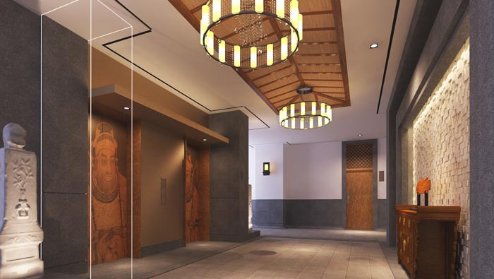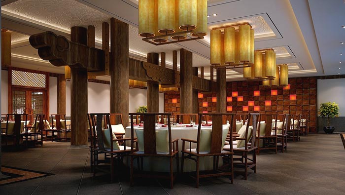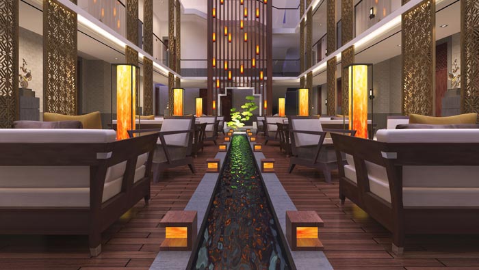 大廳的設計:顧客進入大廳之后,給人的第一感覺就是小溪流入百姓家的感覺,酒店的整體格局是回字形建筑,故此設計師在設計中,就充分發(fā)揮建筑本身的優(yōu)勢,頂部銀河般的燈帶仿佛彩云一般,上頂彩云、下有小溪,給人營造一個生態(tài)化的自然氛圍。