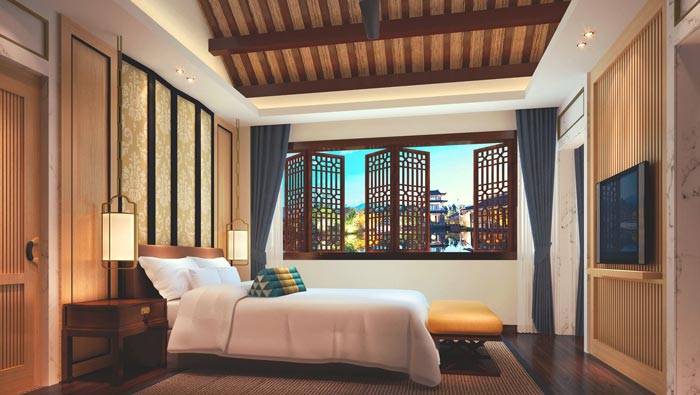 C類客房的設(shè)計(jì):此處的內(nèi)部搭配相對(duì)簡(jiǎn)潔一些,這是由于外部景觀所決定的,相信大家透過(guò)窗戶可以看到對(duì)面的靈臺(tái)樓閣,設(shè)計(jì)師在此處希望讓客戶感受到的正是外部的景色,客戶站在窗邊、坐在床上、躺在床上,以不同的姿勢(shì)去欣賞外部的風(fēng)景,得到的體驗(yàn)也是完全不同的。