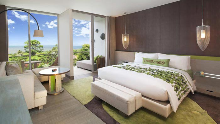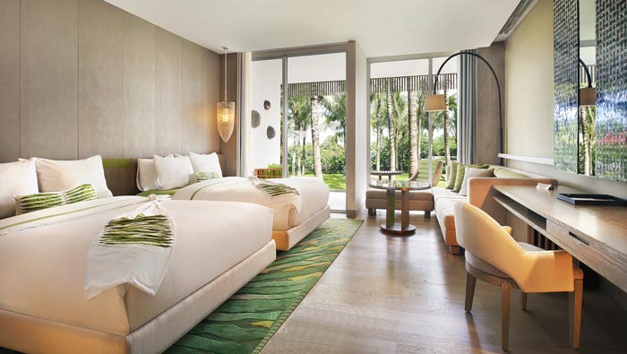 客房的設計:在這里我們感受到的是度假村美麗的景色,在這里我們離自然是那么的近,設計師在設計中也充分考慮到室外景色的引入,在設計師看來客房與戶外景色相互融合,所達到的效果絕不是簡單的1+1,而是將酒店進行了一次全新的深化,讓酒店進行一個全新的升級。