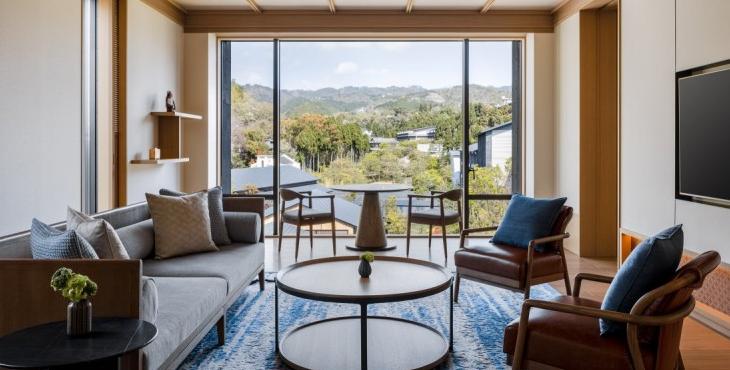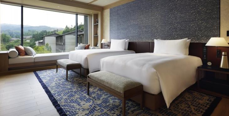 整個(gè)酒店的室內(nèi)設(shè)計(jì)與場(chǎng)地的自然環(huán)境相輔相成,這得益于設(shè)計(jì)事務(wù)所受到傳統(tǒng)日本色彩的啟發(fā),以溫暖的泥土色為空間基調(diào)。酒店客房區(qū)域,標(biāo)準(zhǔn)客房和套房的面積從50㎡到110㎡之間,雖大小不等,但都配置了舒適的沙發(fā)床和開放式概念浴缸,讓客人更好的體驗(yàn)傳統(tǒng)京都里的泡湯文化。