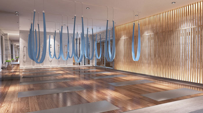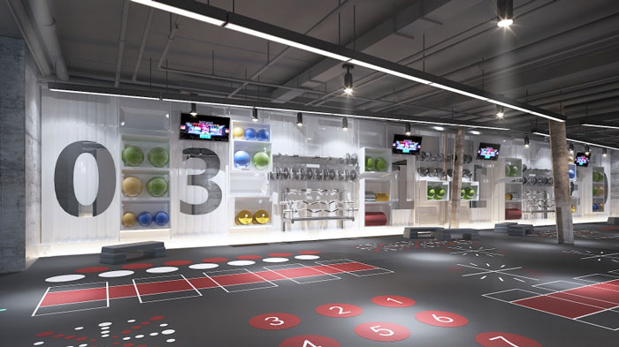 設計理念:根據甲方對此健身房的功能需求,將其分為動感操房、多功能地膠區、瑜伽房、衛浴區和儲物更衣室五個區域。