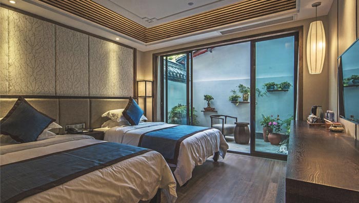 單人客房的設計:此次位于庭院的中心區域,家的感覺也是設計師一貫的追求,設計師希望客戶在這里體會到家的感覺,陽臺供顧客品茶、交流之用,不要小看設計師對于陽臺的延伸,其實此次將整個空間的屬性進行了一次升級,讓客房擁有了茶文化,無形之中提高了顧客的品味。