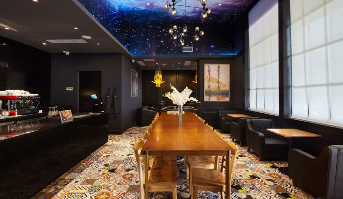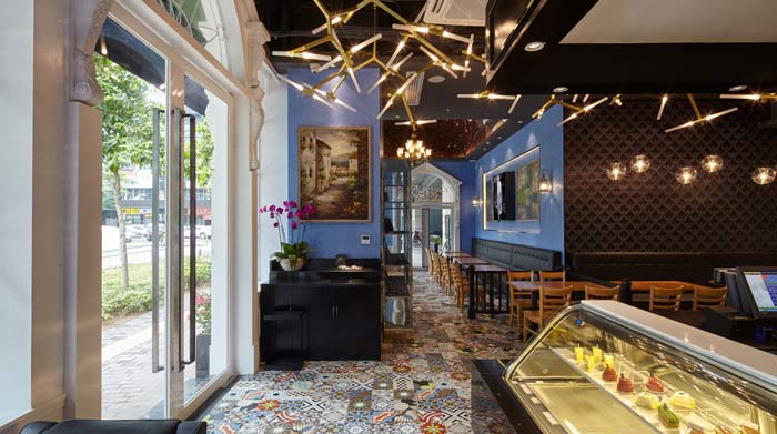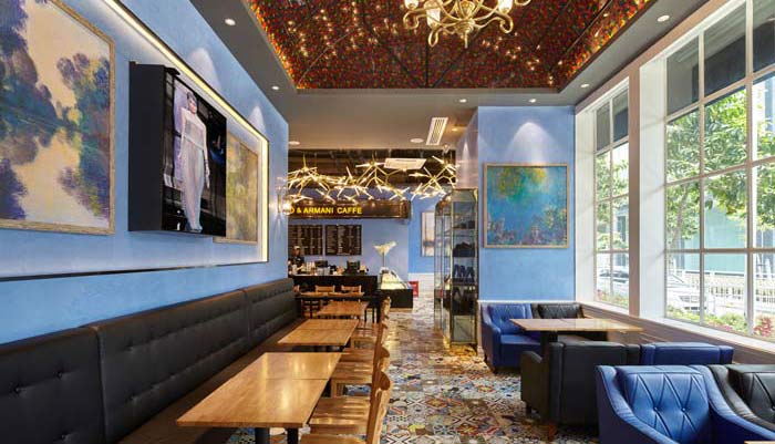延續(xù)了英國(guó)尼祿咖啡的經(jīng)典色彩,融入意大利的古典建筑元素,結(jié)合阿瑪尼的時(shí)尚、簡(jiǎn)約設(shè)計(jì)元素,再加入繪畫(huà)藝術(shù)元素。