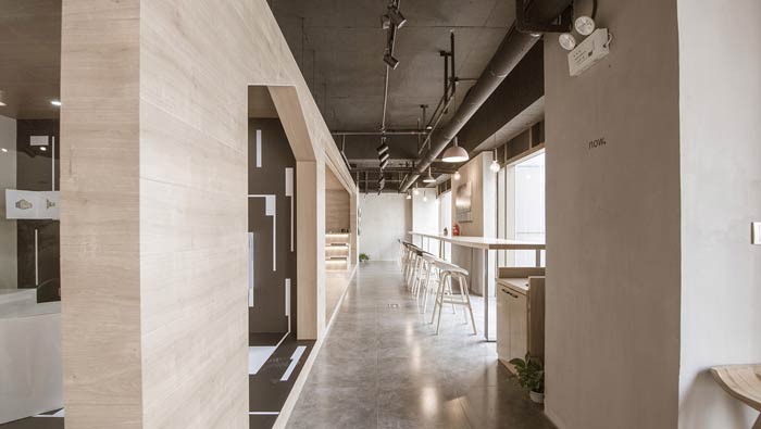 咖啡店走廊設計:相對封閉的空間在左側,開放的空間在右側,過道將封閉空間與開放空間連接在一起,暢通的過道承載起整個空間的運作。
