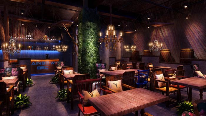 燒烤店進門區裝修設計:客戶進門首先看到的就是BBQ,BBQ是西方的燒烤大會,與中國的燒烤類似,這里集合了中國的燒烤,與西方的燒烤,讓客戶在這里享受到不一樣的風味。