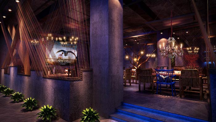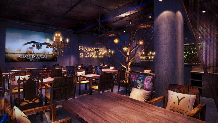 燒烤店屏幕裝修設計:之所以在這里安置屏幕,是業主希望讓客戶在這里享受到的不僅是美食、氛圍,同時也可以看到不錯的影視電影,在電影中感受美好,在美好中享受美食。