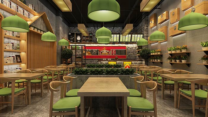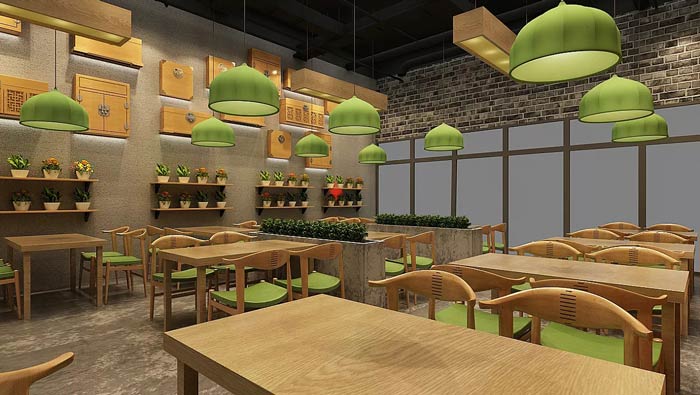 中式快餐店燈飾設計:綠色的燈罩、綠色的綠植、綠色的餐椅,一切的綠色設計是希望給客戶一種綠色的概念,這里的食物都是綠色無污染的,讓客戶在這里吃的放心、吃的安心。