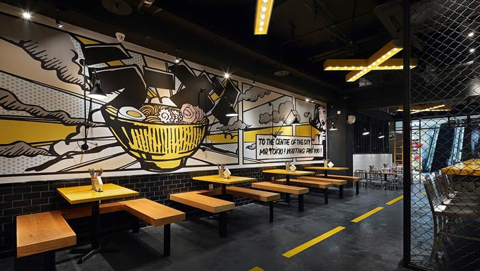 日式快餐店裝修設(shè)計(jì):設(shè)計(jì)師采用了漫畫(huà)元素和工業(yè)感的設(shè)計(jì),其中波普風(fēng)漫畫(huà)、美式復(fù)古霓虹燈、鋁合金壁燈、公園長(zhǎng)凳餐桌、黑色的地鐵磚,整個(gè)融合空間讓餐廳有了自己的特色。