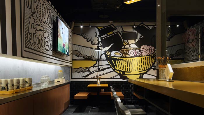 日式快餐店墻畫(huà)裝修設(shè)計(jì):墻面大碗面讓人看了就有食欲,墻畫(huà)講述的是一個(gè)故事,故事內(nèi)容全看客戶(hù)如何理解,設(shè)計(jì)師希望打造一個(gè)有故事的快餐廳,讓快餐廳有自己的文化。
