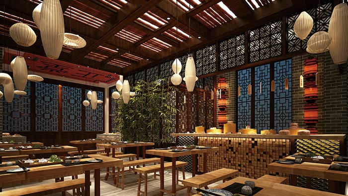 中式面館隔斷裝修設(shè)計:隔斷采用的全部都是木質(zhì)的隔斷,這讓整個中式設(shè)計既視感更加強(qiáng)烈,隔與不隔的空間設(shè)計,讓空間的一切都變的虛中有實、實中有虛,變化無窮。