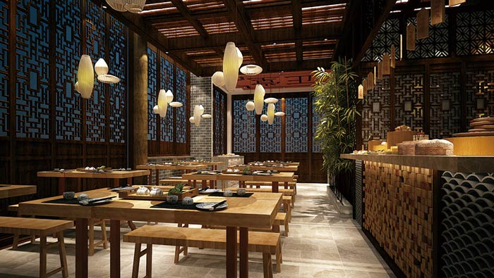 中式面館吧臺裝修設(shè)計:客戶進(jìn)入到面館之后,好似回到了過去,回到了幾百年以前,這讓客戶有一種穿越之感,這里的時間也好似慢了下來,讓客戶享受這難得的平靜。