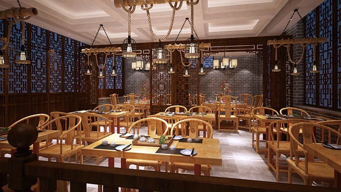 中式面館餐桌裝修設(shè)計:木制的餐桌餐椅,木制的門、木制的吊頂與柱子,整個空間就是一個木制的世界,這里的一切都重現(xiàn)了木的世界,在這里時間慢了下來、空氣清新了起來。