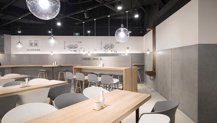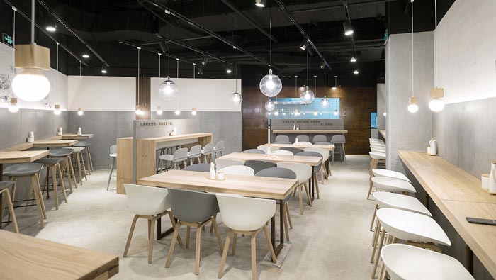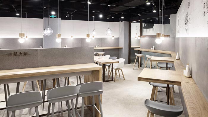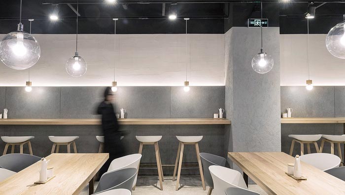 牛蛙面館餐位裝修設(shè)計(jì):對(duì)著墻壁吃面不免局促孤單,而這正是店主與設(shè)計(jì)師想傳達(dá)的理念“專心吃好一碗面”,對(duì)著水泥墻面,吊著一盞溫暖小燈,將注意力集中在食物上。