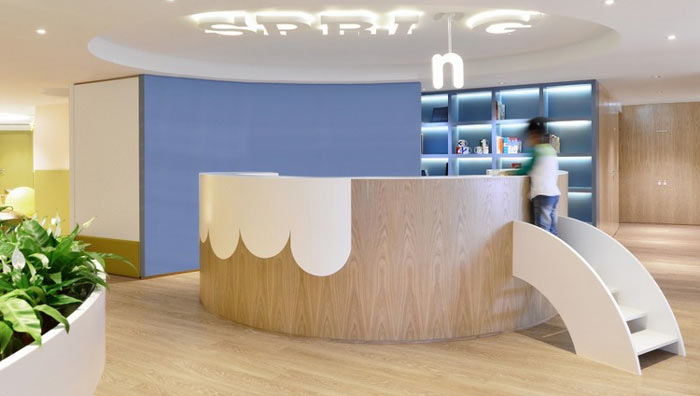 本次為兒童教育培訓機構裝修設計案例,設計師沒有采用童話式的設計元素,取而代之的是中性的設計,白色、淺綠、淺藍的色彩運用、和木材將兒童和家長的視角相結合,并在空間、軟裝的設計細節中表現出來,以此完成兒童、家長和教育工作者之間的對話和互動。