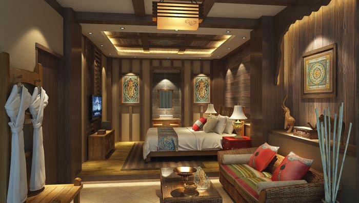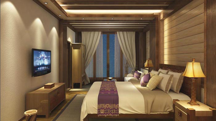 特色單人客房的設計:在此處設計師融入了藏式的裝飾品,并在其中以藏式裝飾為主,因為藏族受到宗教和民俗的影響,對墻面和構件細部的色彩運用和處理,有著各種不同的做法,但唯一不變的就是對人性的追求,在這里我們會感受到宗教的某種特色,在此間我們的心將得到一次凈化。