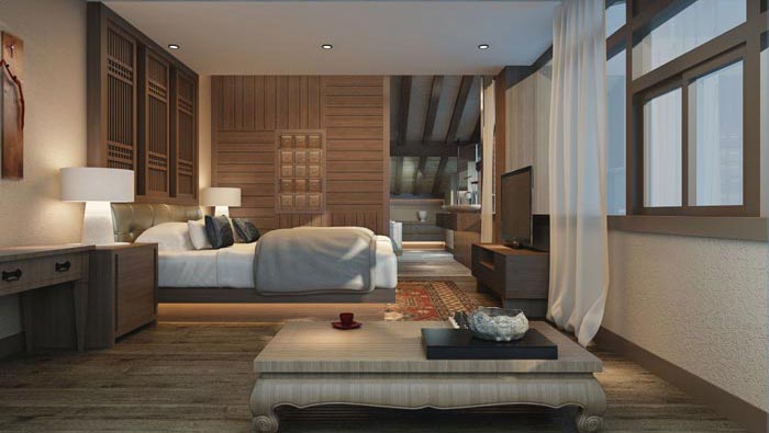 套間的設計:此處位于套間的二樓,一樓主要是做客廳之用,在此處給人的第一感覺就是,我們仿佛回到了古人的生活之中,在這里感覺一切都慢了下來,這也是設計師特意為之,設計師希望讓顧客在這里,可以享受到一個難得的清靜之夜,在這里體味人生的美好。