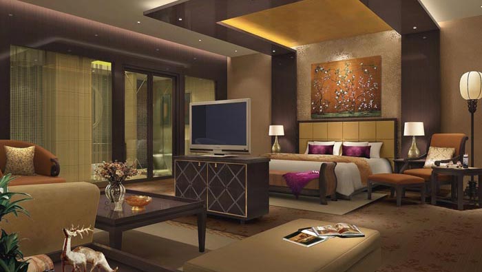 總統(tǒng)套房臥室的設(shè)計:靜怡是此處給人的感覺,在這里給人的感覺不僅是安靜,而更多的是文化的熏陶,床邊的躺椅讓他們躺在那里看書,閱讀書籍是一種享受,在設(shè)計師看來書籍是連接古代先賢的重要媒介,在這里顧客的心可以完全安靜下來,去體會心外無物的哲學(xué)問題。