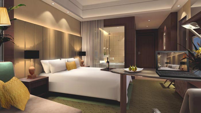 商務(wù)大床房的設(shè)計:此處給人的第一感覺就是安靜與舒適,安靜就是不希望打擾到顧客,在設(shè)計師看來對于勞累一天的客戶來說,他們需要的就是一個人靜靜,酒店要的是深層次的挖掘客戶的需求與習(xí)慣,讓顧客在此處不僅是休息,而是一種心靈的歸零。