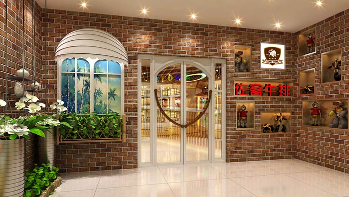牛排西餐廳外立面裝修設計:牛排是餐廳的主打餐品,故此設計師在設計中,將牛排二字特意提出,目的就是在于強調餐廳的屬性,讓客戶知道這里的餐品是什么,而不是一概而論。