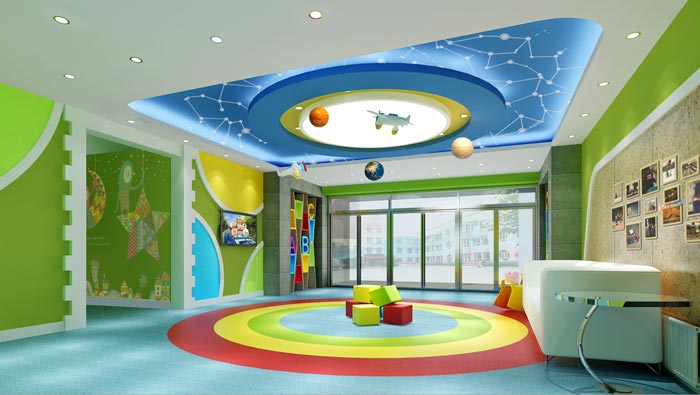 前臺大廳的設(shè)計(jì):陽光透過大門射入室內(nèi),讓人感覺到溫馨與溫暖,設(shè)計(jì)師希望陽光可以無處不在,讓孩子在這樣的環(huán)境下可以健康、快樂的成長,在其中設(shè)計(jì)師采用了陽光、色彩之間的相互交融,設(shè)計(jì)師希望展現(xiàn)在孩子面前的是一個五顏六色的世界。
