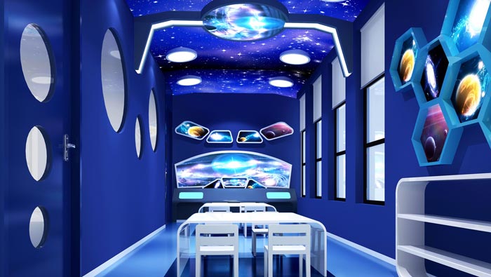 科幻教室的設(shè)計:在這里孩子們可以體驗太空的生活,這里完全都是仿真的設(shè)計,在這里孩子們感覺自己好像在遨游太空,在這里高科技離我們是那么的近,讓孩子見證自己的未來世界,讓孩子對未來充滿期待、憧憬,在設(shè)計師看來教育本來就不能與世界脫軌。