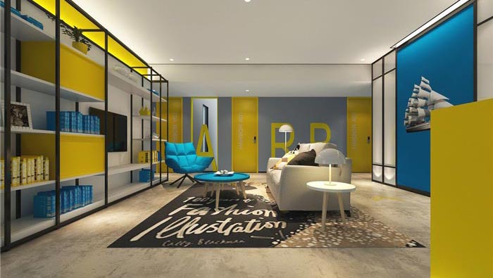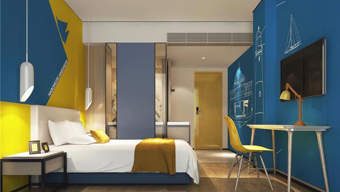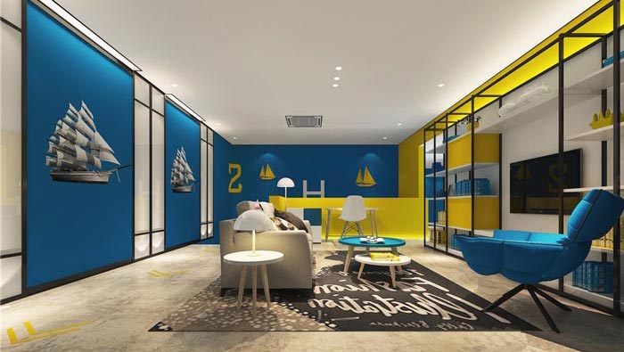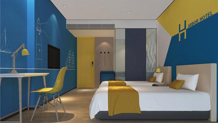 雙人間的設(shè)計:空間以藍(lán)黃兩色為主,就是希望打造一個簡約、時尚的住宿空間,仿木紋的地板、玻璃隔斷以及由花磚拼接而成的墻面裝飾,種種設(shè)計都是為了給客戶營造一種強(qiáng)烈的層次感和時尚感,其中藍(lán)色海洋與帆船,寓意著如家一般的溫馨港灣。