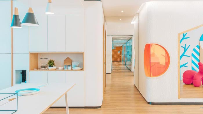 前臺區域的設計:設計師在設計的時候,采用白色做為主色調,其中加入了藍色、褐色等各種色彩,白色為主色調給人一種溫暖、明亮的感覺,其他顏色做為點綴之用,白色本身就有向外散發的屬性,可以在一定程度上提升空間的視覺感受。