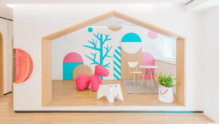 接待區域的設計:在設計上設計師加入了調皮、溫馨的元素,但是在元素的控制上設計師顯得十分小心,讓彼此之間都不會感到反感,因為不管對于孩子還是對于大人來說,對于元素的認可度都是不同的,所以設計師做了多次調研,最后將其控制在一定的比例之內,讓大人、小孩感受的元素是完全不同的。